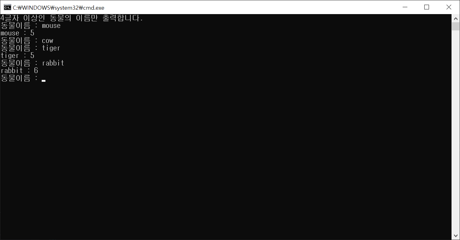 Console.WriteLine("4글자 이상인 동물의 이름만 출력합니다.");