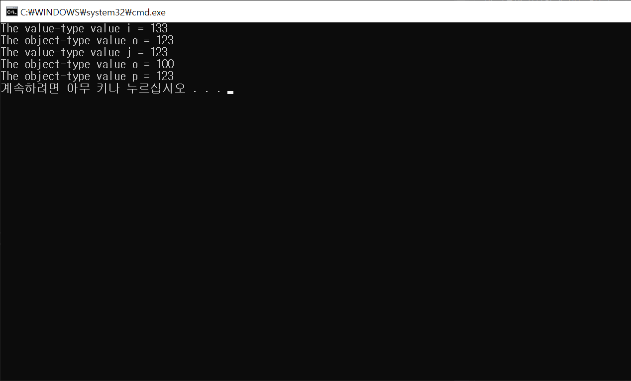 다음 예제는 원래의 변수와 박싱된 object는 서로 다른 메모리 영역을 사용하기 떄문에 다른 값을 저장할 수 있다는 것을 알 수 있습니다.