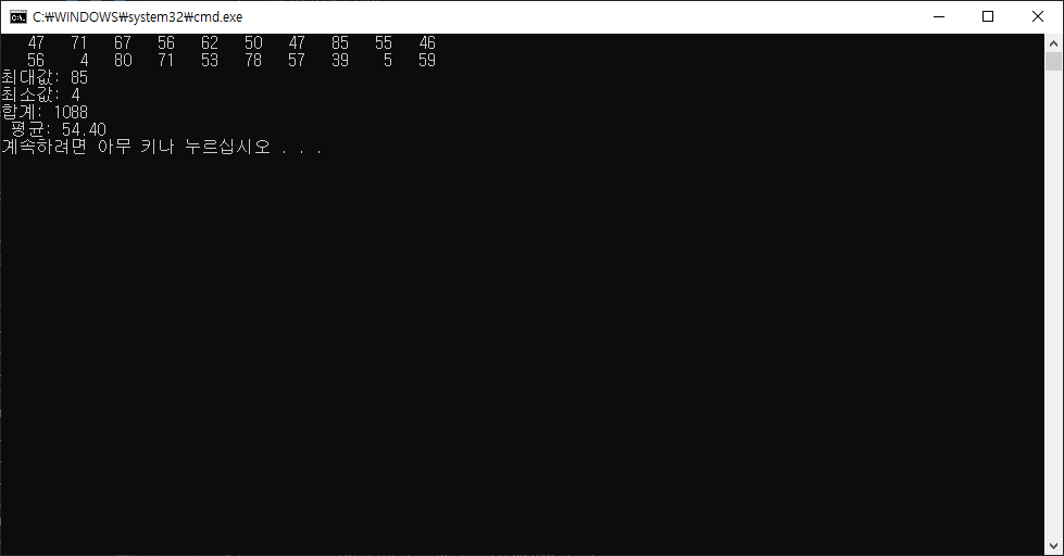 Console.WriteLine("합계: {0}\n 평균: {1:F2}", sum, (double)sum / v.Length);