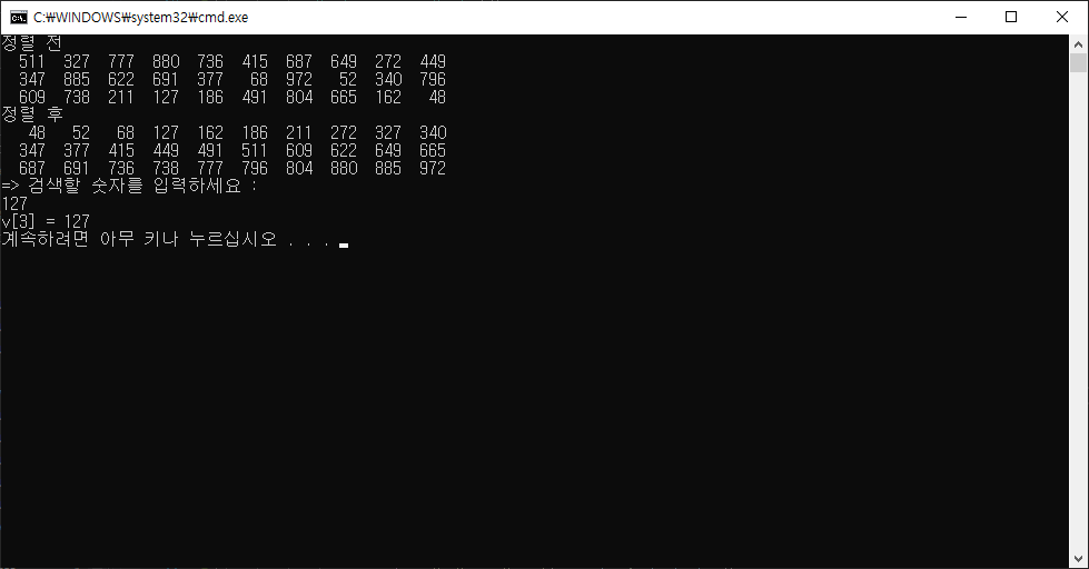 Array.Sort(v); // 정렬, 이진탐색은 배열이 정렬되어야 합니다.
