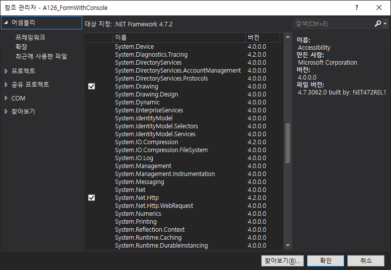 프로젝트 > 참조 > System.Windows.Forms와 System.Drawing을 추가해야한다.