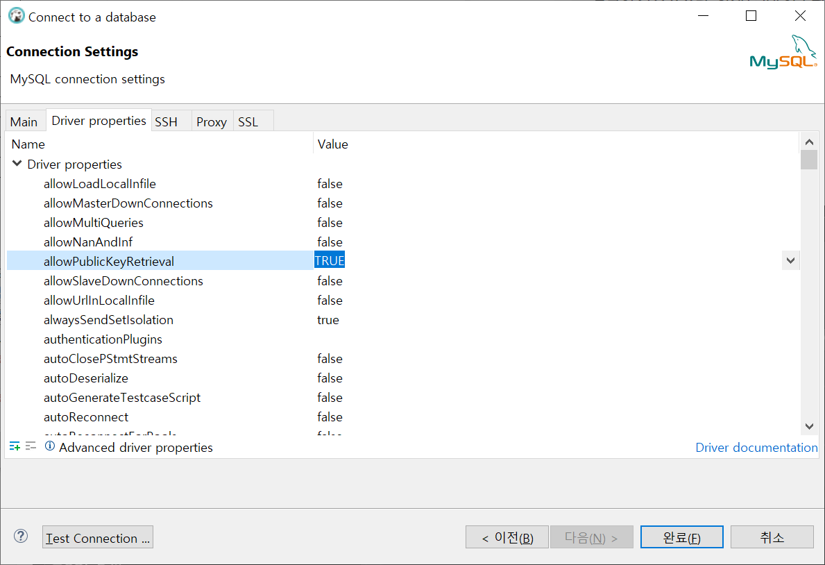 Driver properties에서 allowPublicKeyRetrieval을 TRUE로 세팅한다.