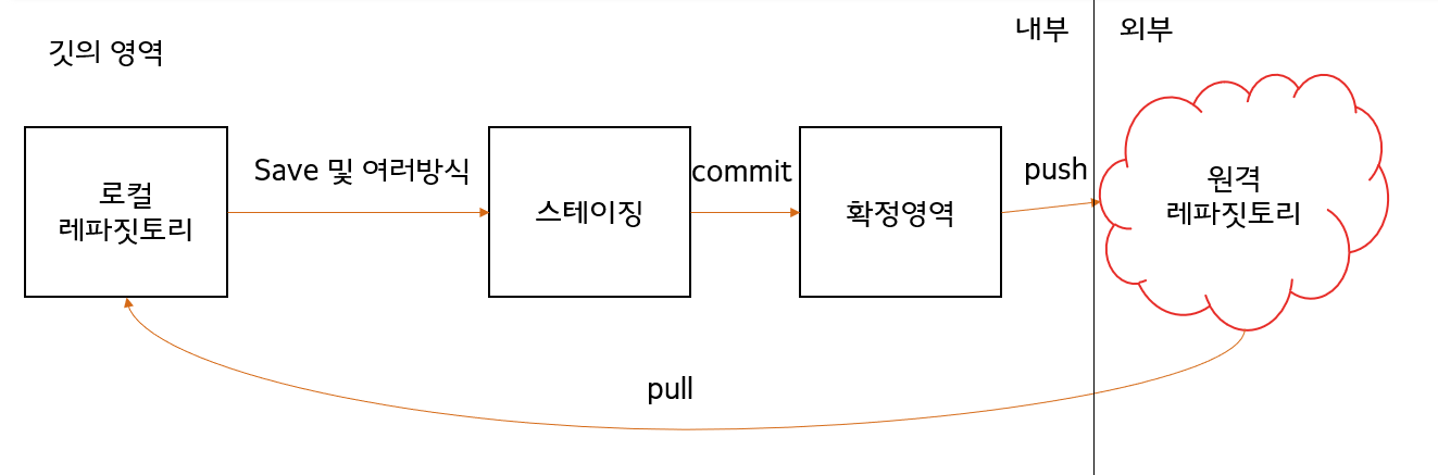 깃에는 영역이 있습니다. -> 로컬(내부->내PC), 원격(외부->Github)
