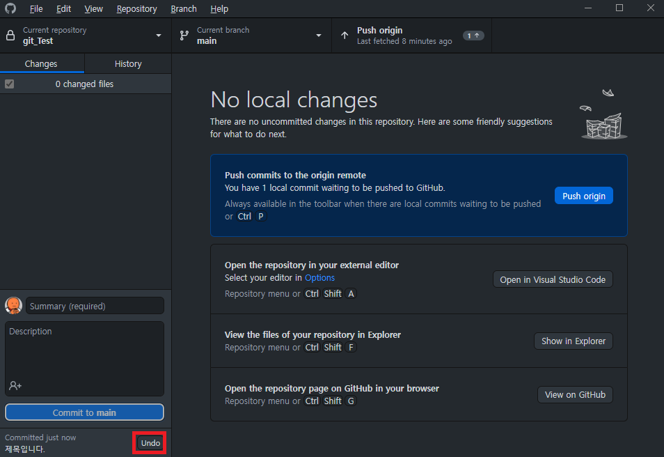 여기서 Undo를 누르면 방금한 Commit이 취소되어 이전으로 돌아와집니다.