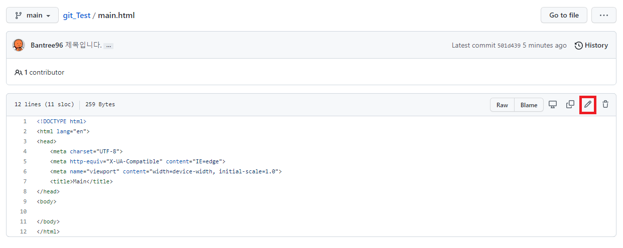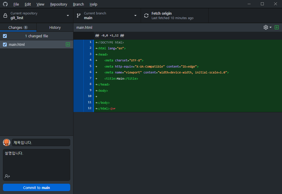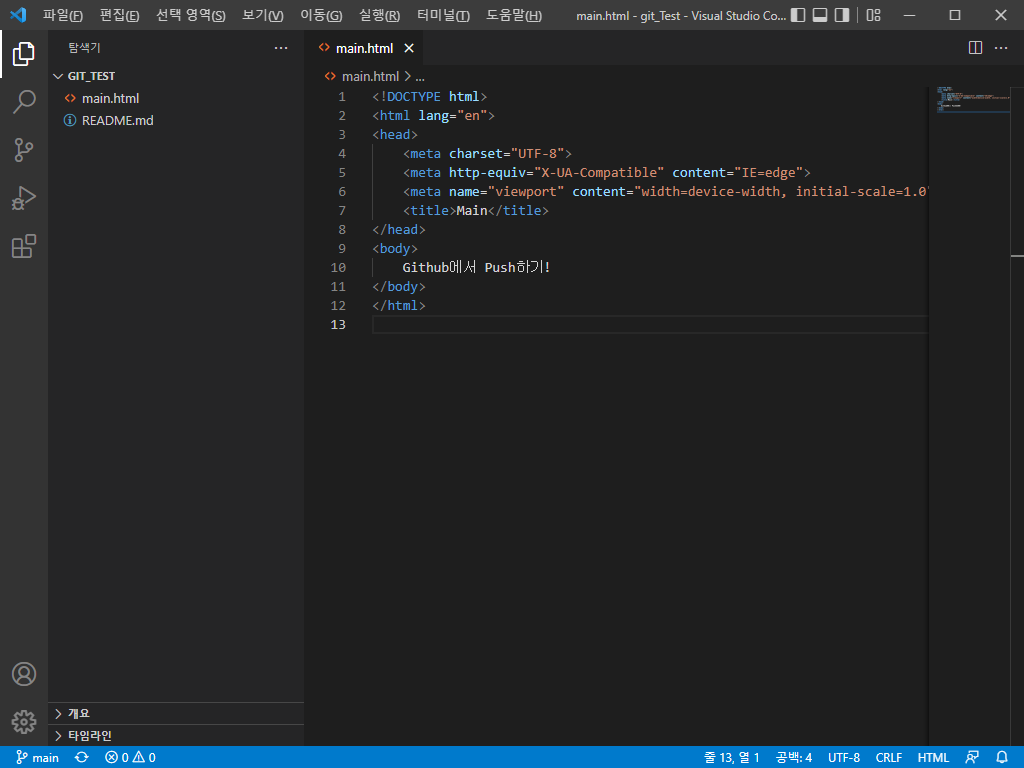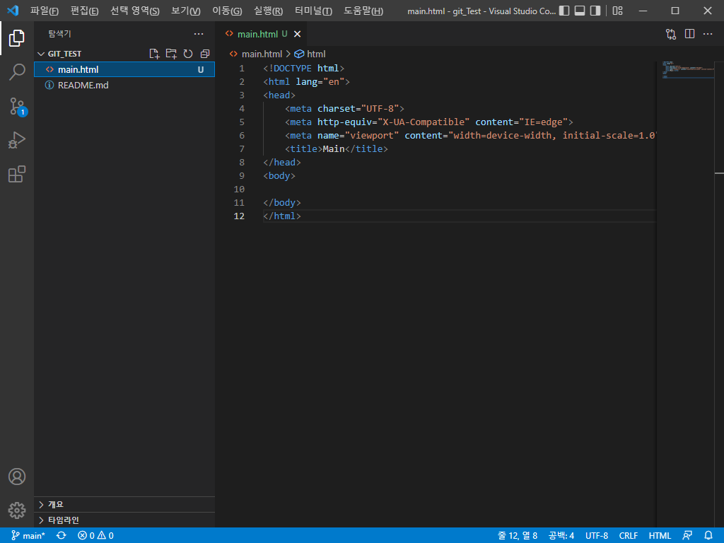 우선 저번글에서 만들었던 레파짓토리에 main.html을 생성합니다.