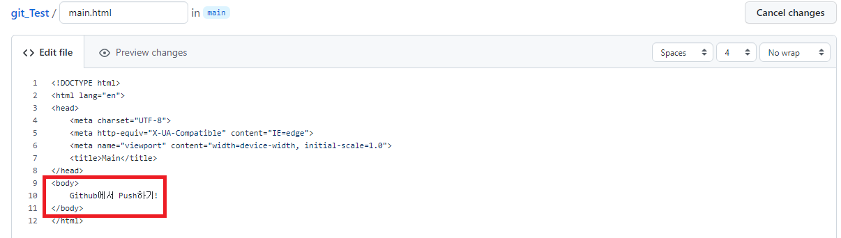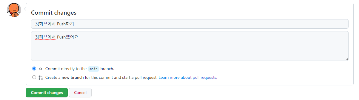 여기서 Commit의 제목, 설명을 적고 Commit to main버튼을 누르면 Commit이 됩니다.