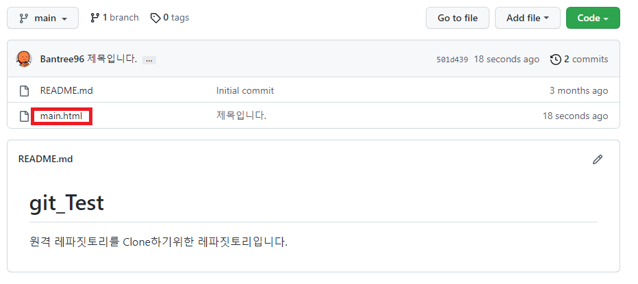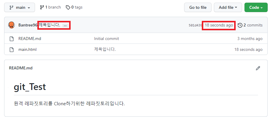 Github 레파짓토리를 확인해보면 시간과 제목으로 방금 push한 내용을 확인 할 수 있습니다.