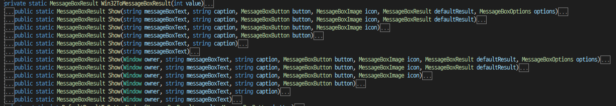각 버튼들은 MessageBoxResult를 반환하며, 그 값을 조건문을 통해 처리 할 수 있습니다.