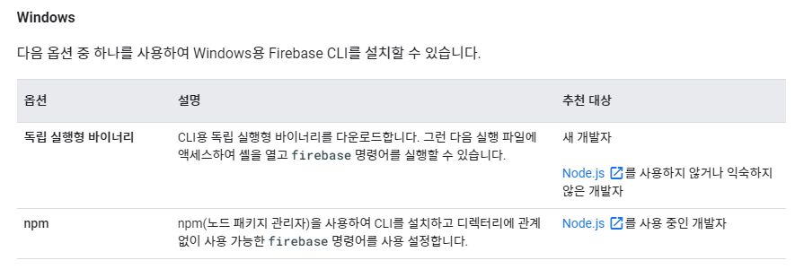 Node.js설치 후 cmd창에서 아래와 같은 코드를 입력해 Firebase CLI를 설치합니다.