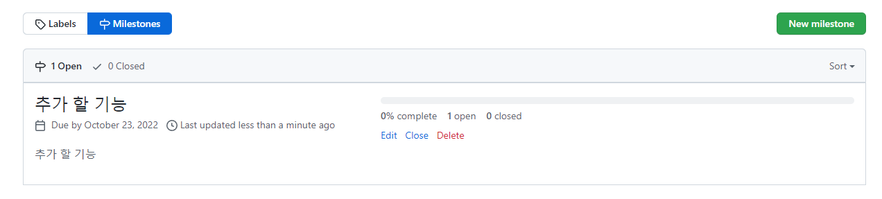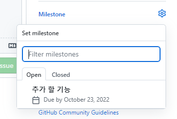 - Milestone : 해당 이슈가 어떤 마일스톤의 하위 이슈인지