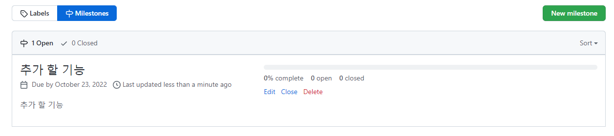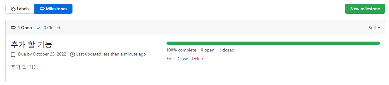 마일스톤에 이슈가 추가된것을 확인 할 수 있으며, Close시 아래와 같이 Complete됩니다.
