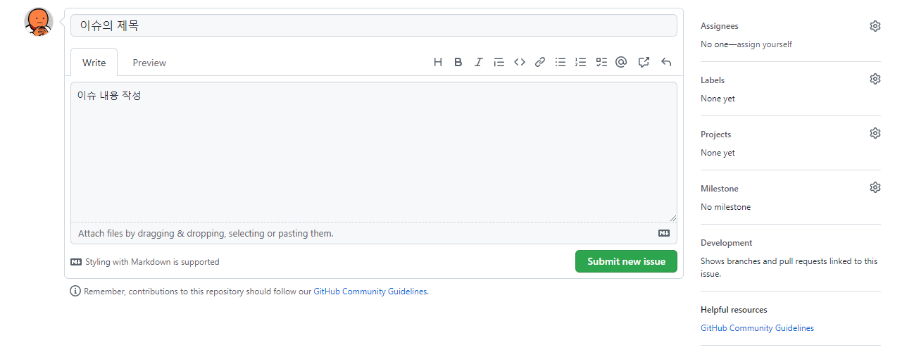 New issue 버튼을 클릭하면 아래와 같이 나옵니다.