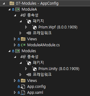Shell에선 IoC에 관련된 패키지가 사용되었고 실제 View가 있는 Module에서 Wpf 패키지가 사용되었습니다.