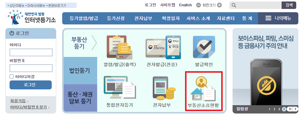 부동산 소유현황 누르고 비회원 로그인 한 뒤, 조회하면 됩니다.